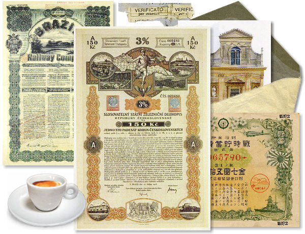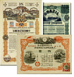 昔の証券・証書 - 切実な紙切れ-これは外国の証券と日本の軍事国債・・・いずれも倒産や敗戦で紙切れになりました。当時の情勢の中で資金調達が出来るかどうかは文字通り死活問題だった筈、その自信と切実感に溢れた精緻で威厳に満ちた図柄が儚さをかきたてます。 |